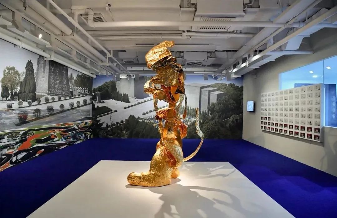(左)《开壳——伏虎》,不锈钢、⾦箔、电镀、烤漆,82x240x130cm,2023年©邬建安